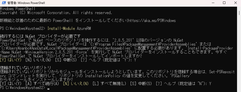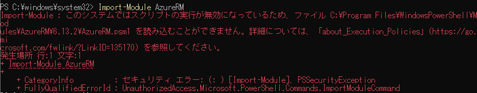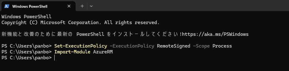 上記、エラーが出る場合には下記コマンドを実行し、実行ポリシーを変更して実施してください。