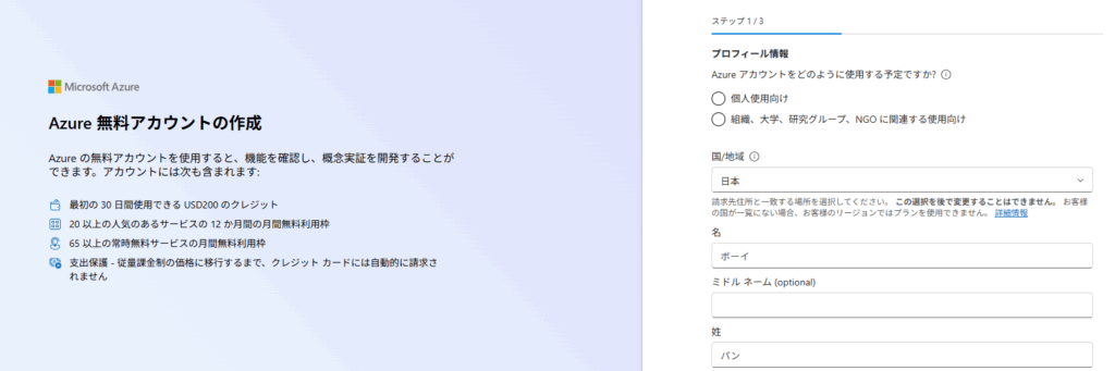 Azureはクレジットカードとかの登録が必須の都合上、本名での登録が良さそうです泣
